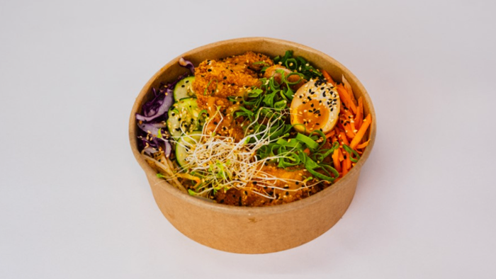 Bowl z ryżem sushi, kurczakiem w panko, marchewką piklowaną, kapustą, goma-wakame, kiełkami mung, jajkiem nitamago, ogórkiem, dymką i sezamem.