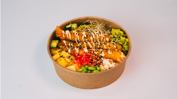 Bowl z ryżem sushi, krewetkami w panko (3szt), ananasem, marchewką, kiełkami mung, paskami nori, ogórkiem, dymką i sezamem.